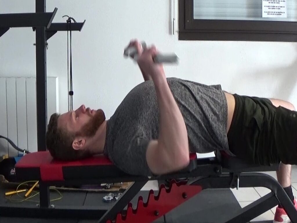 DÉMONSTRATION TECHNIQUE Saisissez vos haltères, allongez-vous sur un banc, amenez les haltères à hauteur de poitrine à l’aide de vos