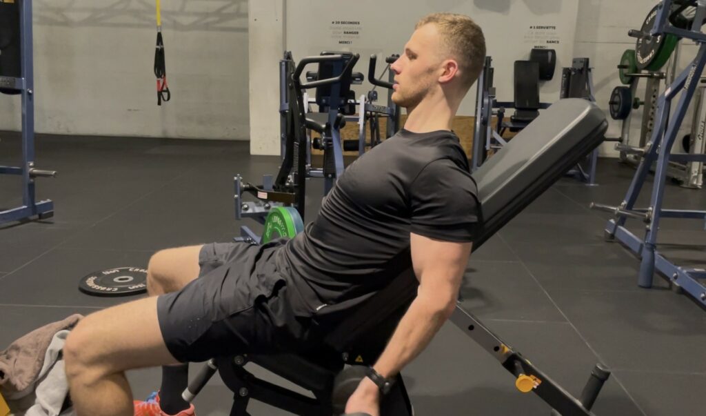 DÉMONSTRATION TECHNIQUE Saisissez vos haltères en prise supination, asseyez-vous sur un banc plus ou moins incliné à 45° en gardant